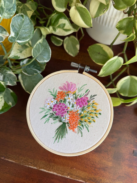 Hand painted with watercolours, and hand stitched with embroidery floss. Hoops may be embellished with glass seed beads, and are all backed with felt.