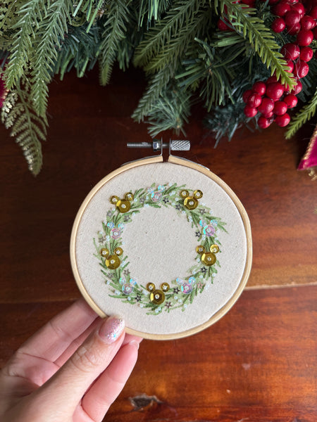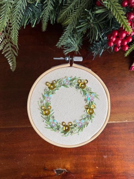 Handmade with watercolour, embroidery floss, beads, and sequins and backed with felt, 4” hoops are one of a kind.
