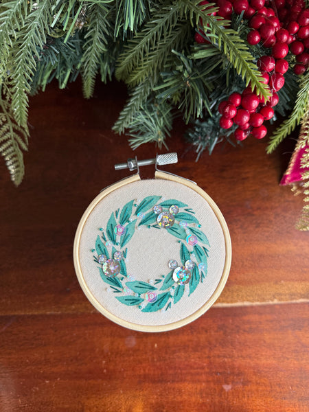 Handmade with watercolour, embroidery floss, beads, and sequins and backed with felt, 3” hoops are one of a kind.