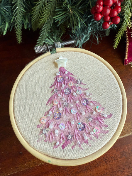 Handmade with watercolour, embroidery floss, beads, and sequins and backed with felt, 3” hoops are one of a kind.