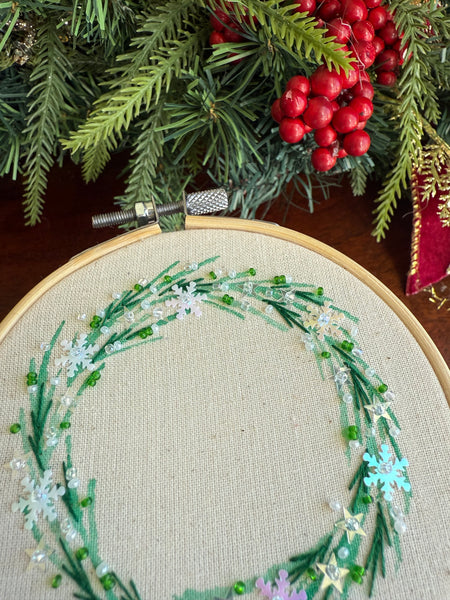 Handmade with watercolour, embroidery floss, beads, and sequins and backed with felt, 4” hoops are one of a kind.